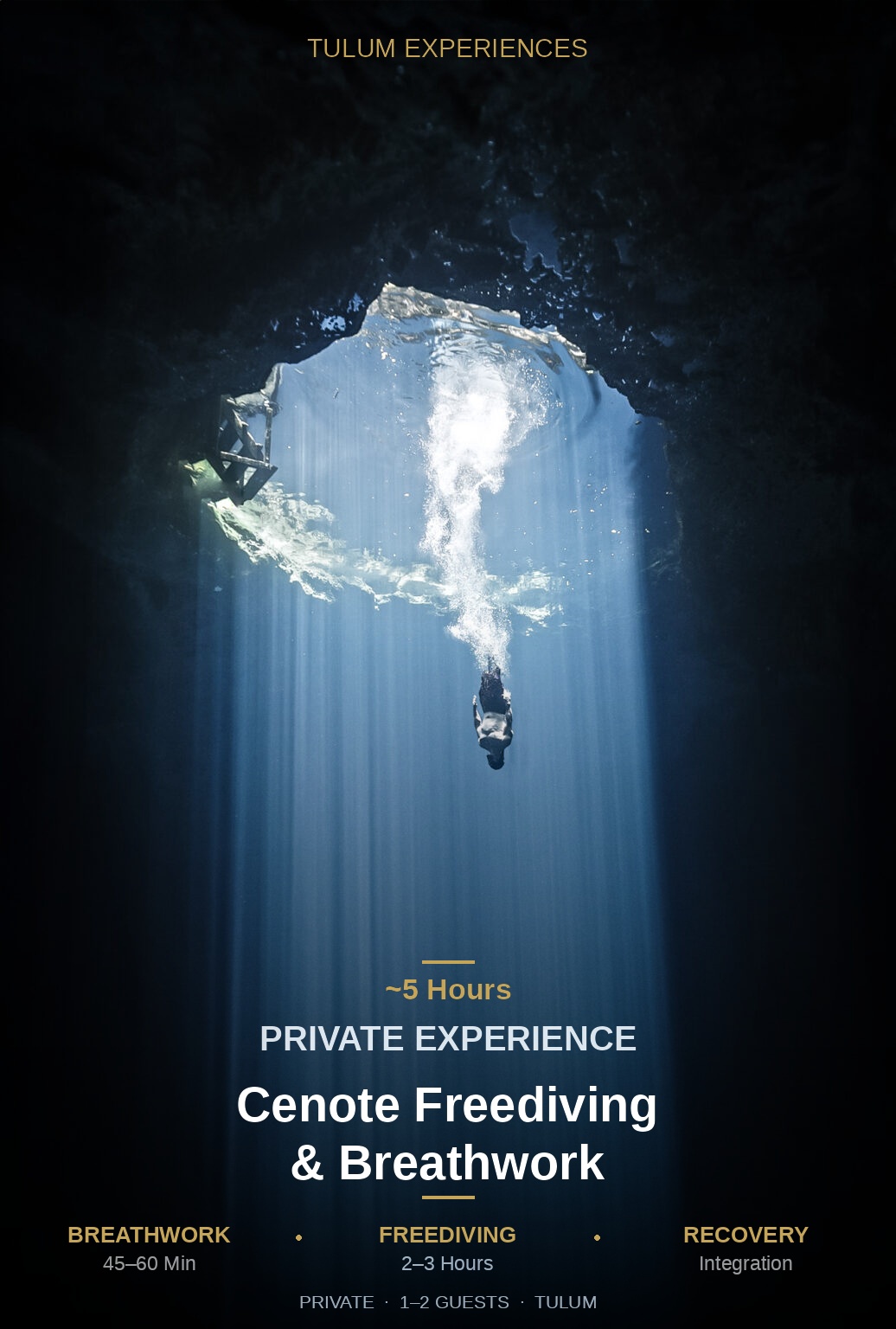 A private cenote freediving and breathwork experience in Tulum — combining guided breathwork, nervous system preparation, and 2–3 hours of freediving in one of the most unique underwater environments in the world.